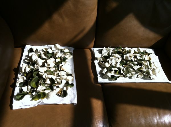 回家後,就把鐵線拆了,將果皮分開三片,今天趁中午陽光普照,就開始曬。舊同事說,不用每年拿出來曬,但在這個月盡情曬,收太陽就收回屋內,曬得乾乾脆脆就可以入樽。