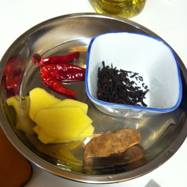 調料:鹽,胡椒粉,茶葉少許,薑一塊,乾紅辣椒3-4隻,陳皮一塊