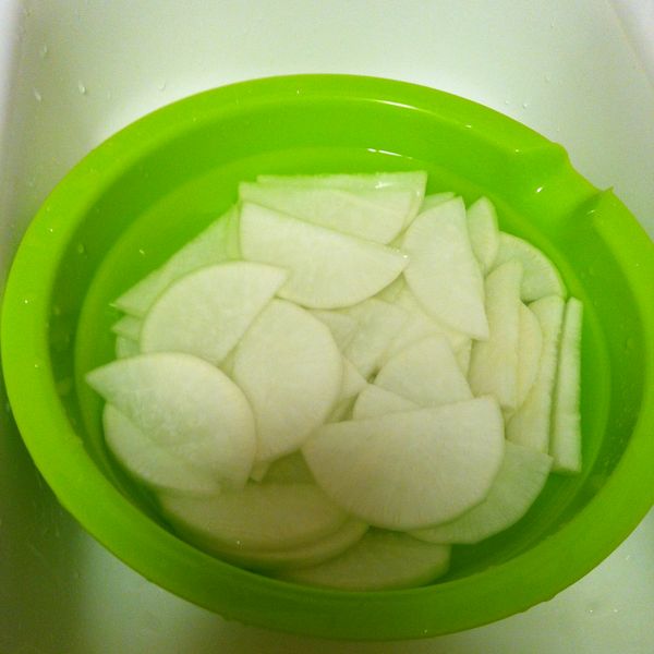 4. 看牛肉酥爛後,分出部分肉湯(可以入冰箱冷藏或冷凍,留做下頓),將白蘿蔔去皮,切成薄片,加入砂鍋,調入鹽,繼續煮15-20分鐘,即可關火。