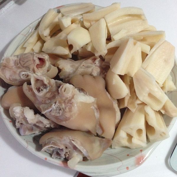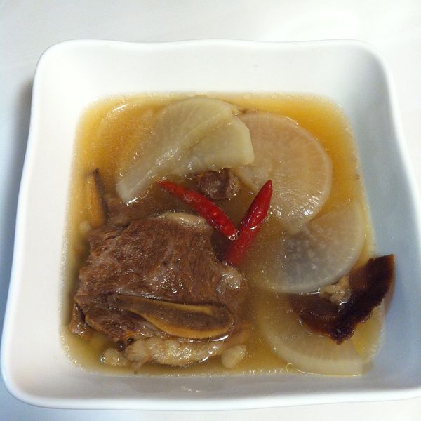 材料:白蘿蔔半個,急凍牛仔骨四條,紅辣椒4隻,茶葉少許,果皮一塊,薑數片。