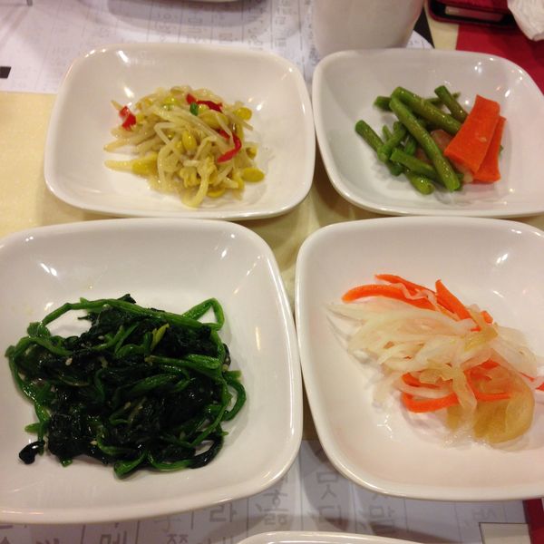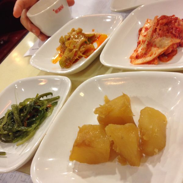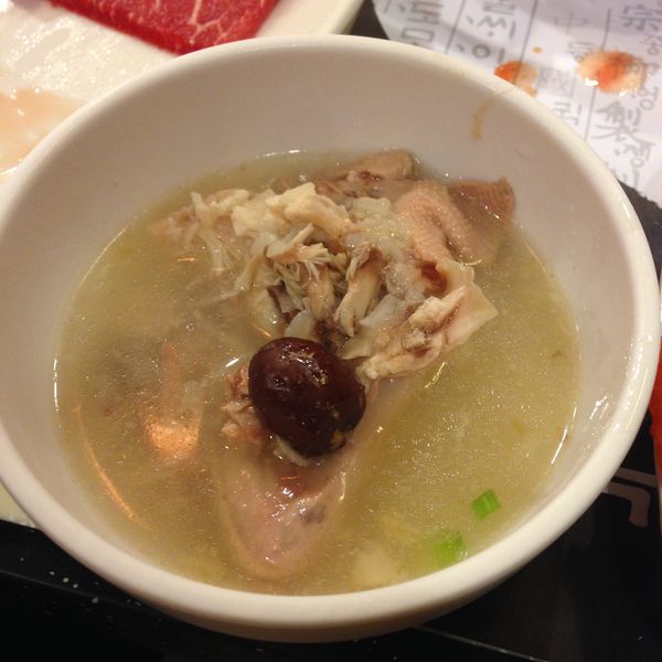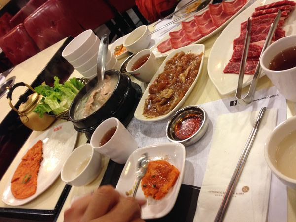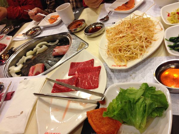 牛肋骨、原味牛脊肉、秘製人蔘汁牛脊肉(人蔘味不足)、牛舌、雞肉、豬肉拼盆(豬扒、、五花腩、醃肉,其中醃過節豬肉帶少許辣,但好吃)、海鮮拼盆(八爪魚、魚、青口、魷魚、蝦、帶子)、蛋煎翠肉瓜(好吃)、煎豆腐、人蔘雞湯(糯米較少,人蔘味不足)、泡菜煎餅、生菜盆、辣味香蔥(這兩款是用來配烤肉吃的)。