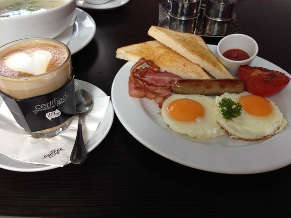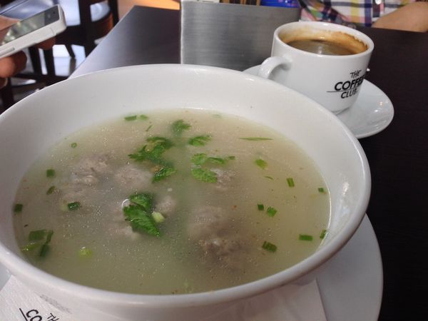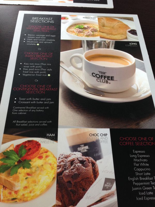 我點了煙肉、腸、雙蛋、蕃茄和多士,配鮮奶咖啡;花老爺點了泰式豬肉湯飯,配黑咖啡。