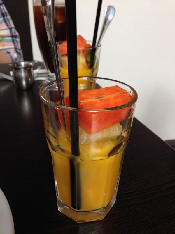 這天早上8點半起床,9點吃早餐,這家酒店不是自助早餐,共有七款,如果每款都合口味,就可以天天不同。主食之前,有一杯雜果橙汁,還有一杯咖啡或茶。