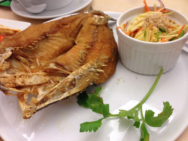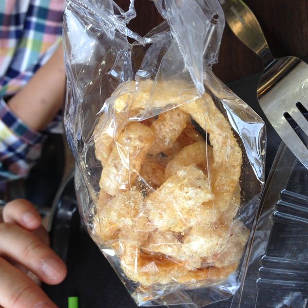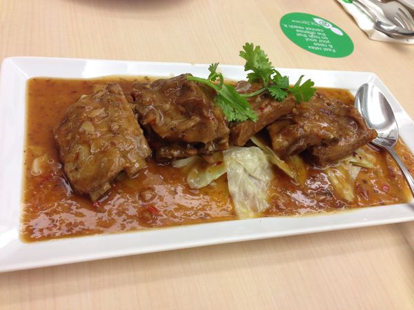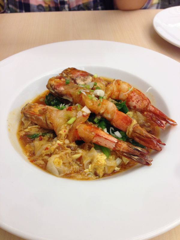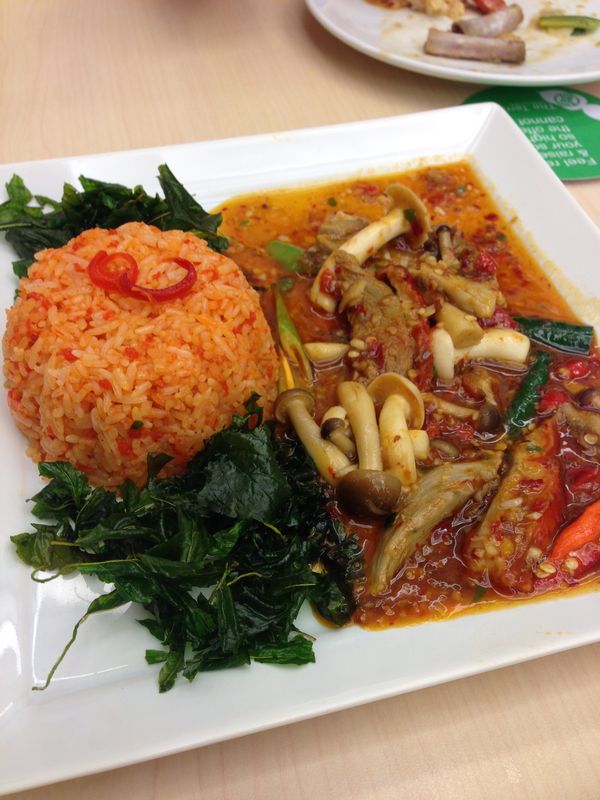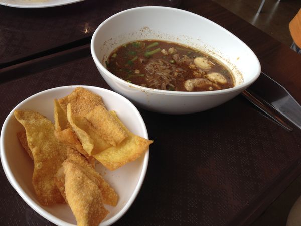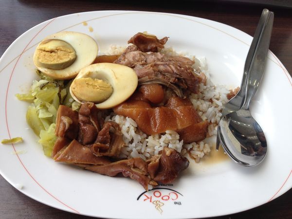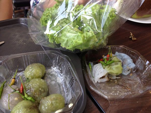 差不多下午1點,還是先照顧五臟廟,午餐也是光顧這裏的Food Court,這裏比昨天的商場的平宜很多。我點了豬手、豬腸、鹵蛋飯、椰青;花老爺點了泰式金邊粉、炸雲吞、西瓜+蜜瓜+檸檬汁,之後又叫特色甜品一同分享,裏面節餡大甜又鹹,有些是西米外皮,配細小的辣椒、生菜、香葉來吃,還有炸豬皮。