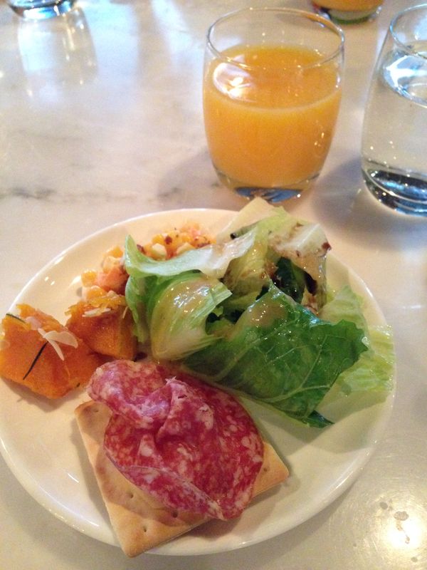 先來前菜,沙律和芝士、沙樂美腸克力架餅乾、橙汁。