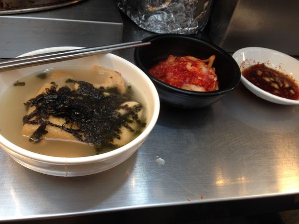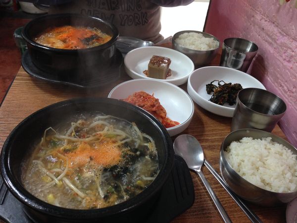 我點了全州黃豆芽湯飯,因為我喜歡吃大豆芽,花老爺點了微辣泡菜豆芽湯飯,我是第一次在韓國吃湯飯,熱騰騰的石鍋,冬天吃一定暖笠笠,店舖雖小,味道還不錯。不過,真的湯不可以貎相,看上去完全不辣的湯,其實是辣的,還好這程度的辣我還可以吃。