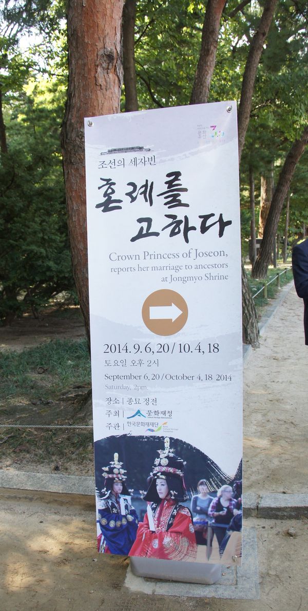 然後10點左右,帶著餘下的飯焦作乾糧便出門了。先坐地鐵5號線到鍾路三街下車,步行前往宗廟。進入宗廟不久,就看到一個宣傳,10月4日和18日有兩場關於世子嬪婚禮式在宗廟舉行,即當日下午2時有一場,這是意外收獲,不過我們下一站德壽宮,在下午3:30也有換兵儀式。