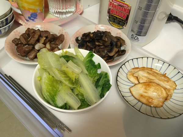 這餐叫做多幾個菜,俾大家睇吓啦!灼羅文生菜、煎雞柳、炒磨菇和牛肉粒。