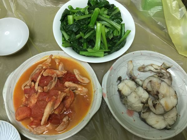 這餐更簡單,蕃茄煮雞柳、忘記是甚麼魚、清炒菜心。