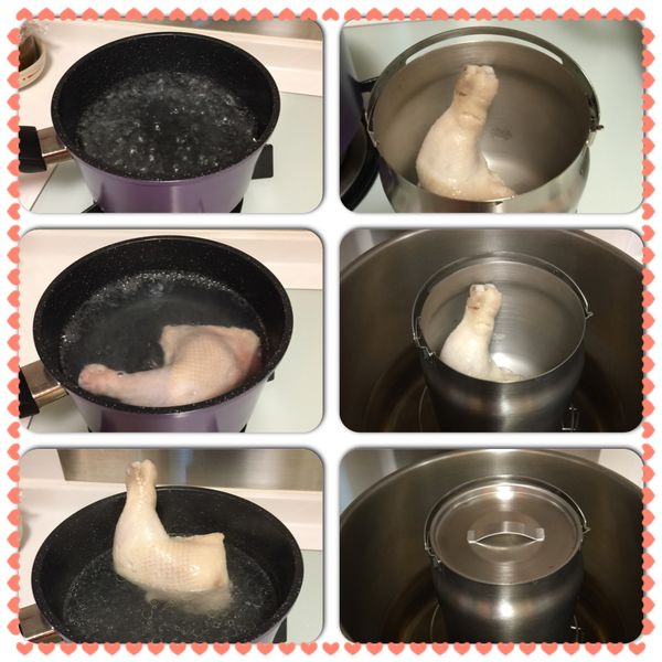 雞脾洗淨汆水,用一個放得下雞脾的有蓋器皿盛著,蓋上蓋(沒有蓋可用錫紙封好),放入大煲內隔水煮。冷水開大火,水滾後再滾15分鐘,轉中火煮45分鐘(注意乾水)。